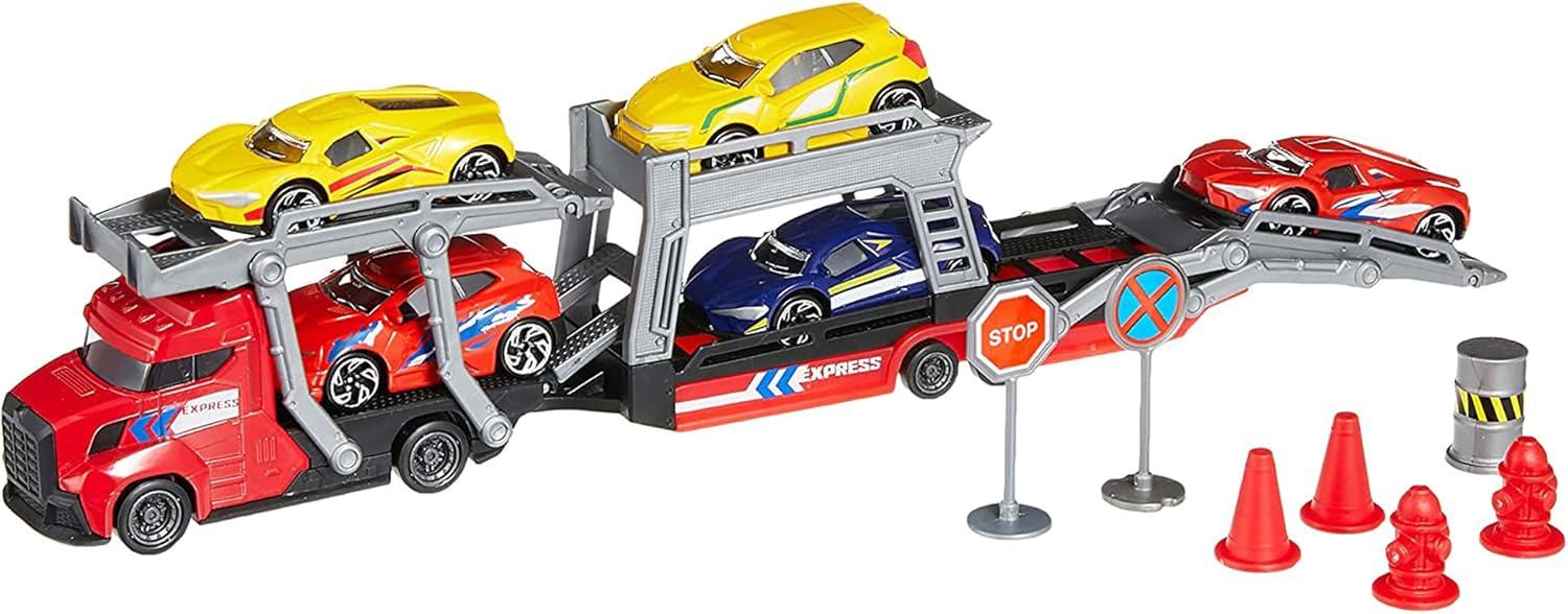 Dickie Toys Car Carrier: Much more fun than normal piggybacks! With the Dickie Toys Car Carrier, the fun increases in line with the number of axles. The free-wheeling car transporter has space for five die-cast toy cars, which are also conveniently included in the set. Additional moving parts ensure authentic-looking loading and unloading. Extra traffic signs make up a perfect playset! WARNING: CHOKING HAZARD Small parts. Not for children under 3 yrs.